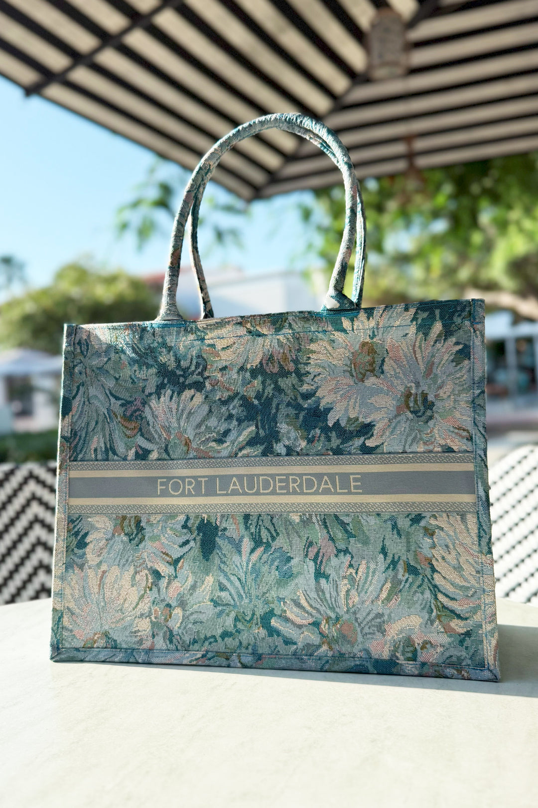 Carry the charm of one of these "Resort Cities" (Naples, Hilton Head, Charleston, Ft. Lauderdale, Amelia Island, Vero Beach) with this elegant blue floral tapestry-style canvas tote.
