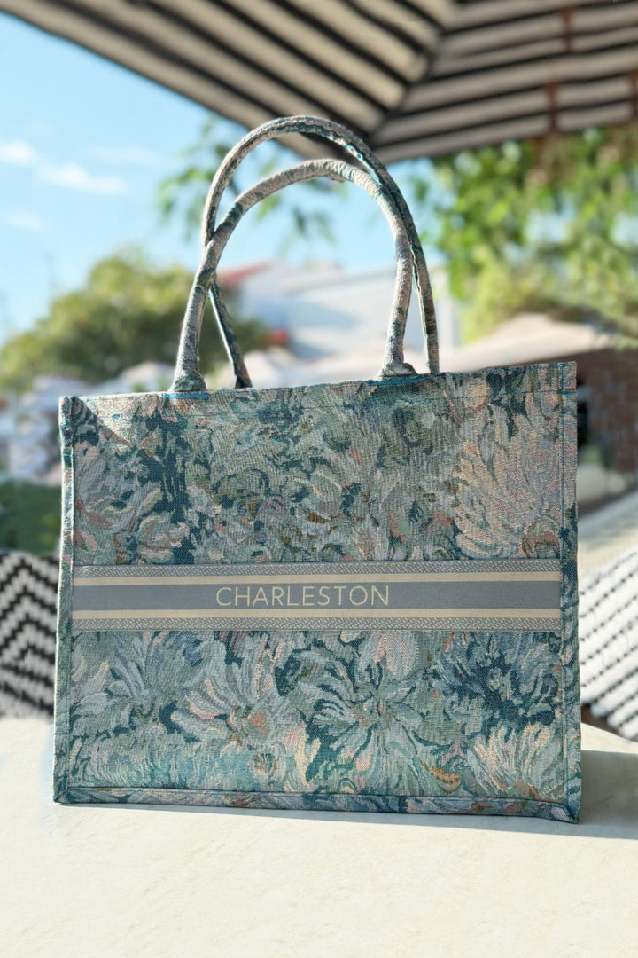 Carry the charm of Charleston with you with this elegant blue floral tapestry-style canvas tote. Chic, spacious, city-inspired, bring a piece of your favorite destination wherever you go.