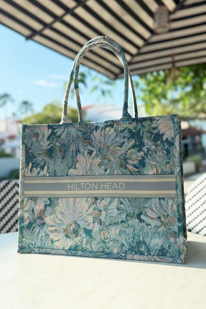 Carry the charm of Hilton Head with you with this elegant blue floral tapestry-style canvas tote. Chic, spacious, city-inspired, bring a piece of your favorite destination wherever you go.