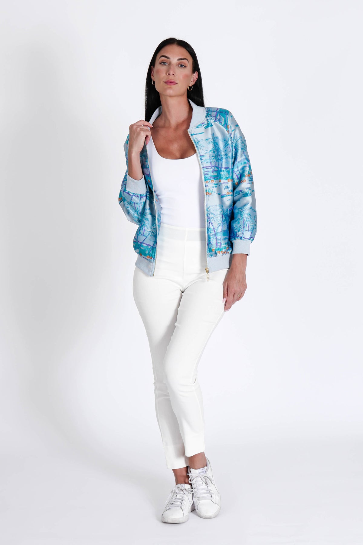 Elevate your style with the Bomber Jacket Hawaiian Palms Blue. This bold jacket combines casual comfort with edgy flair, featuring a vibrant palm print that sets you apart. Perfect for those who dare to be different, it’s a statement piece that adds a fresh, trendy vibe to any outfit.