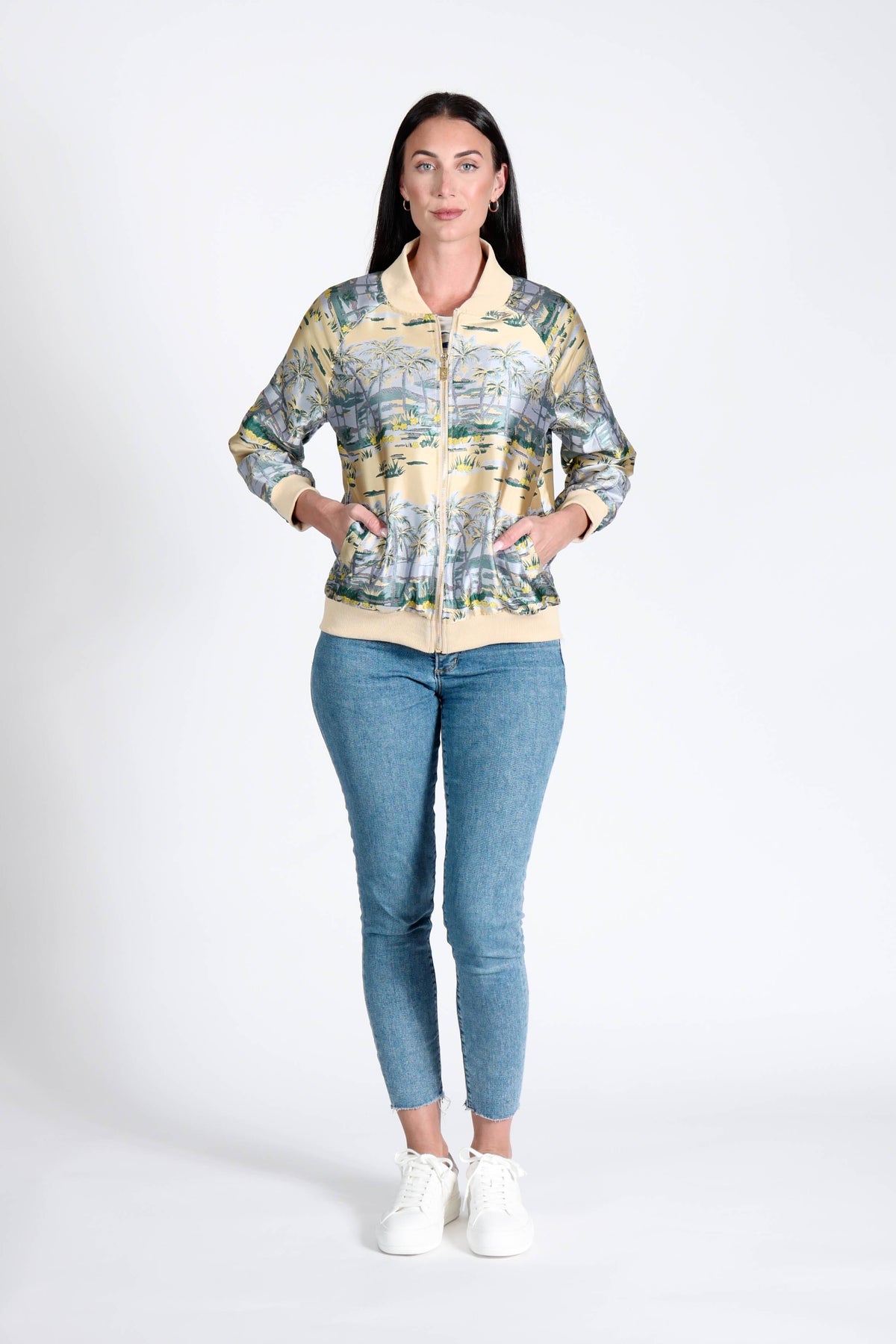 Elevate your style with the Bomber Jacket Hawaiian Palms Gold. This bold jacket combines casual comfort with edgy flair, featuring a vibrant palm print that sets you apart. Perfect for those who dare to be different, it’s a statement piece that adds a fresh, trendy vibe to any outfit.