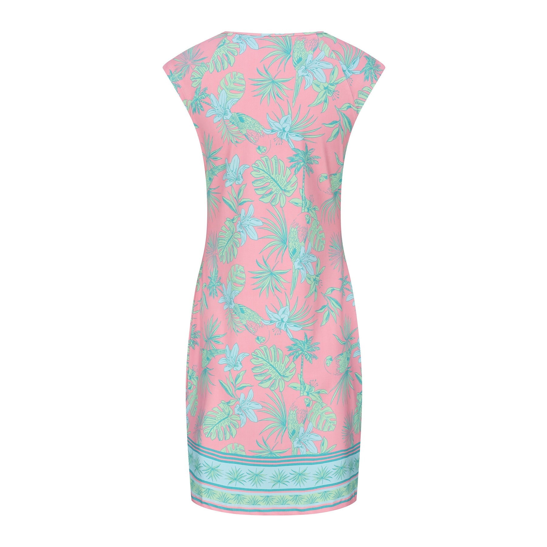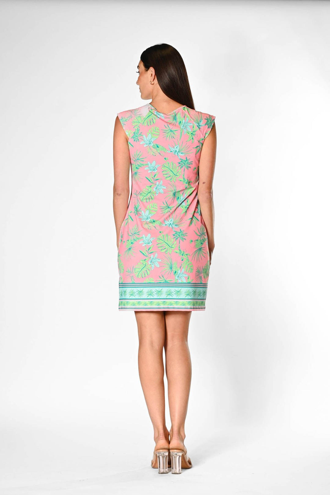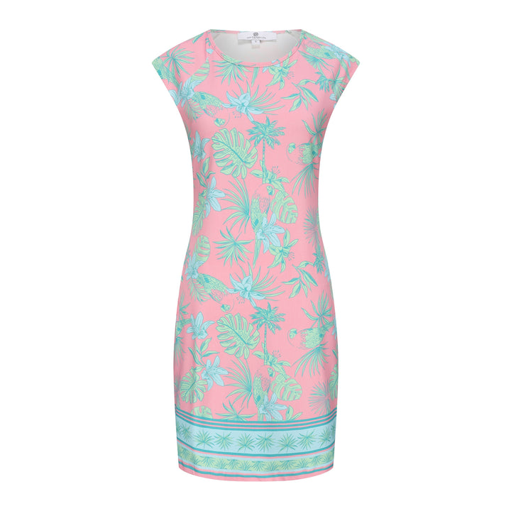 The Lily Dress is back and cooler than ever! Find an array of new beautiful prints and colors in one of our most popular dress. The dress is accentuated by a hemmed border, that ties in beautifully with the shape and pattern. This print embodies romance and features an orchid and palm pattern in pastel colors. Style with a light sweater and heels for a elegant look.