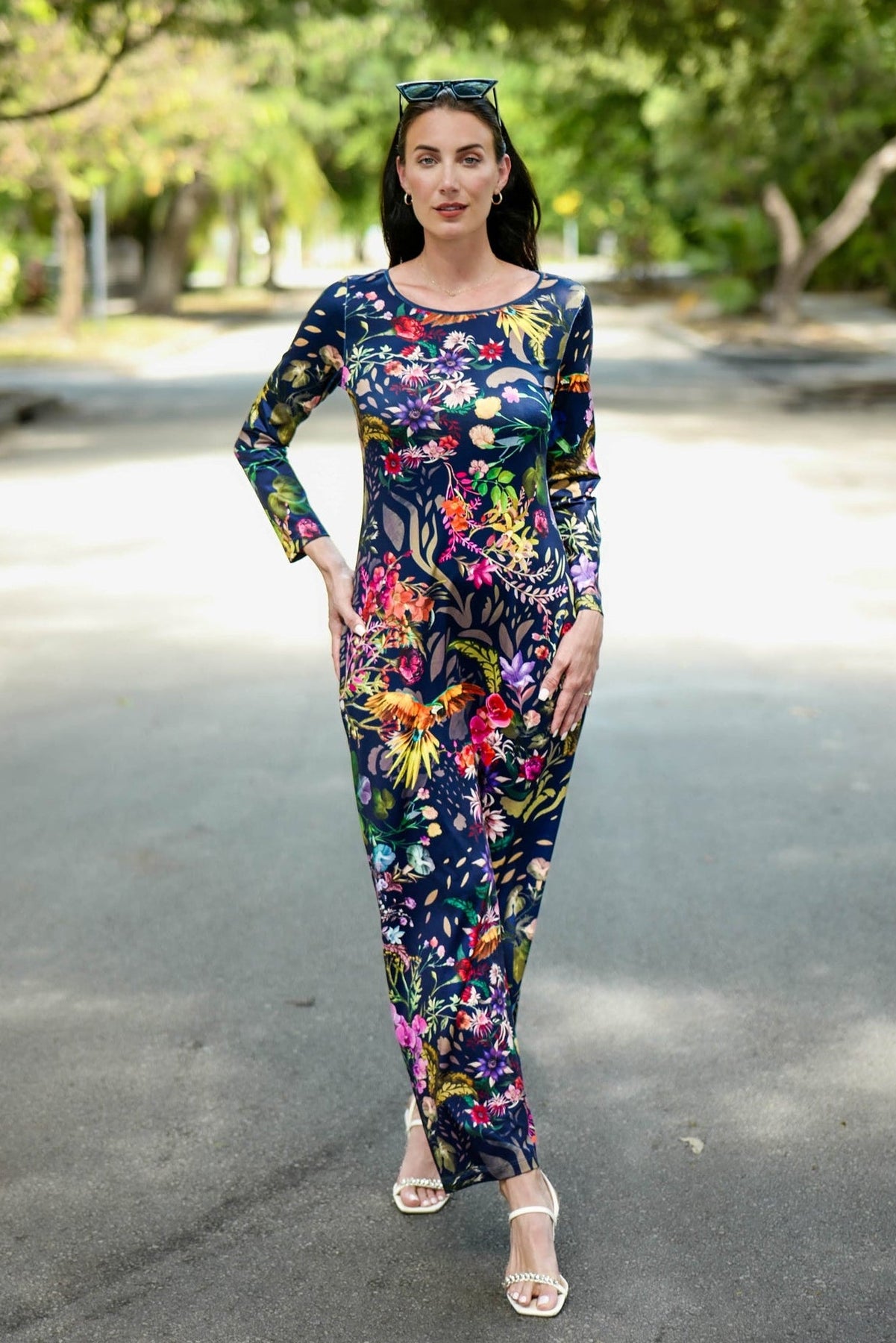 Designed for versatility and confidence, this dress showcases a maxi silhouette with a straight hem, a classic round neckline, and long sleeves. The fabric is a comfortable polyester/spandex blend with natural stretch, ensuring a flattering fit that moves with you all day.