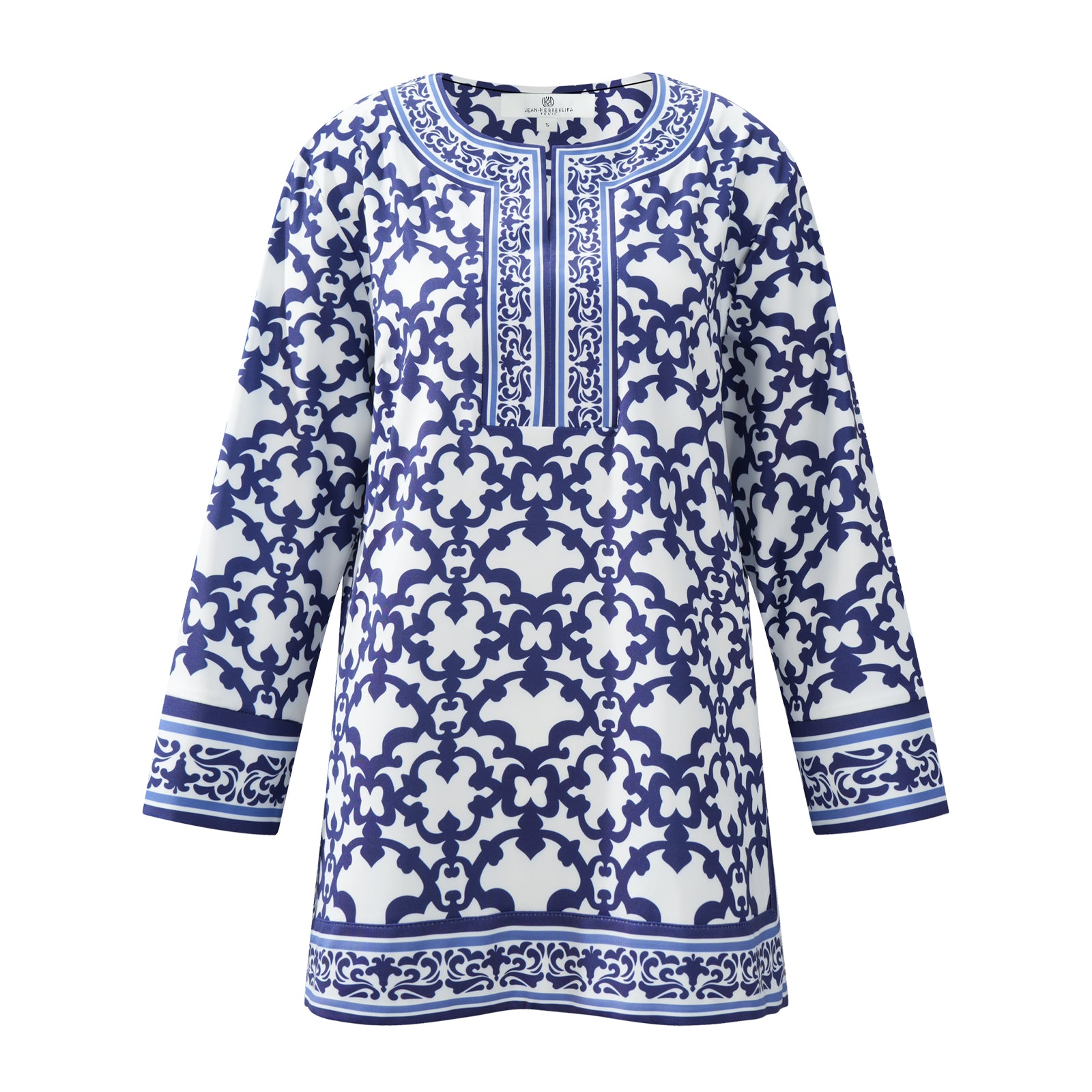 Alexandra Top Iron Gates White brings a whisper of femininity to everyday elegance with graceful 3/4 sleeves and a delicate round collar accented by a soft front slit. Designed in France and crafted from a silky nylon-spandex blend, it offers comfortable stretch for easy movement on warm coastal days or breezy evening strolls. UPF 50+ fabric shields your skin from the sun, and the flattering silhouette skimps the body without clinging.
