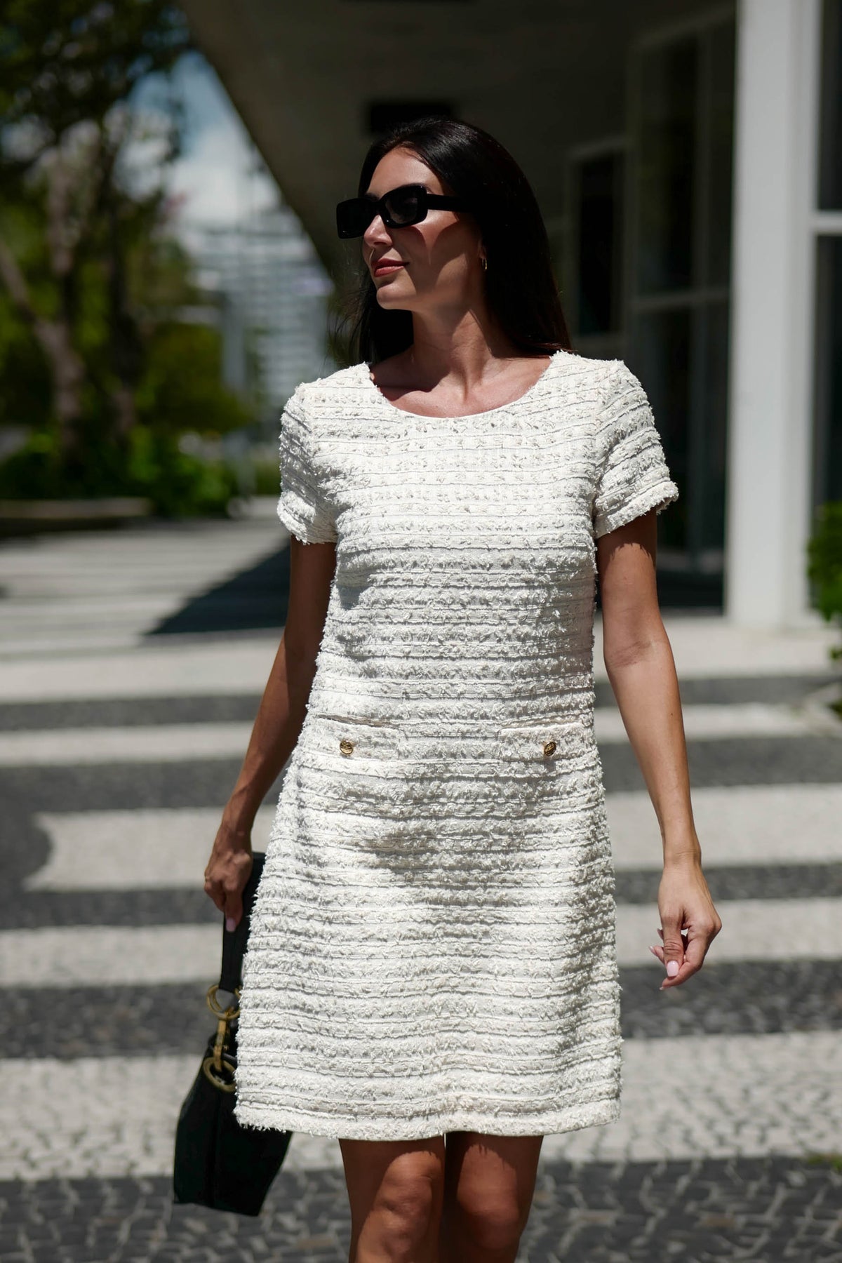 Barrington Dress White is an icon of timeless sophistication. This elegant dress features a refined textured weave and a feminine, structured silhouette that flatters with effortless grace. Its classic lines, short sleeves, and discreet front pockets with golden details evoke understated Parisian charm, perfect from luncheon to soirée. Available in white, blue, pink, and green.