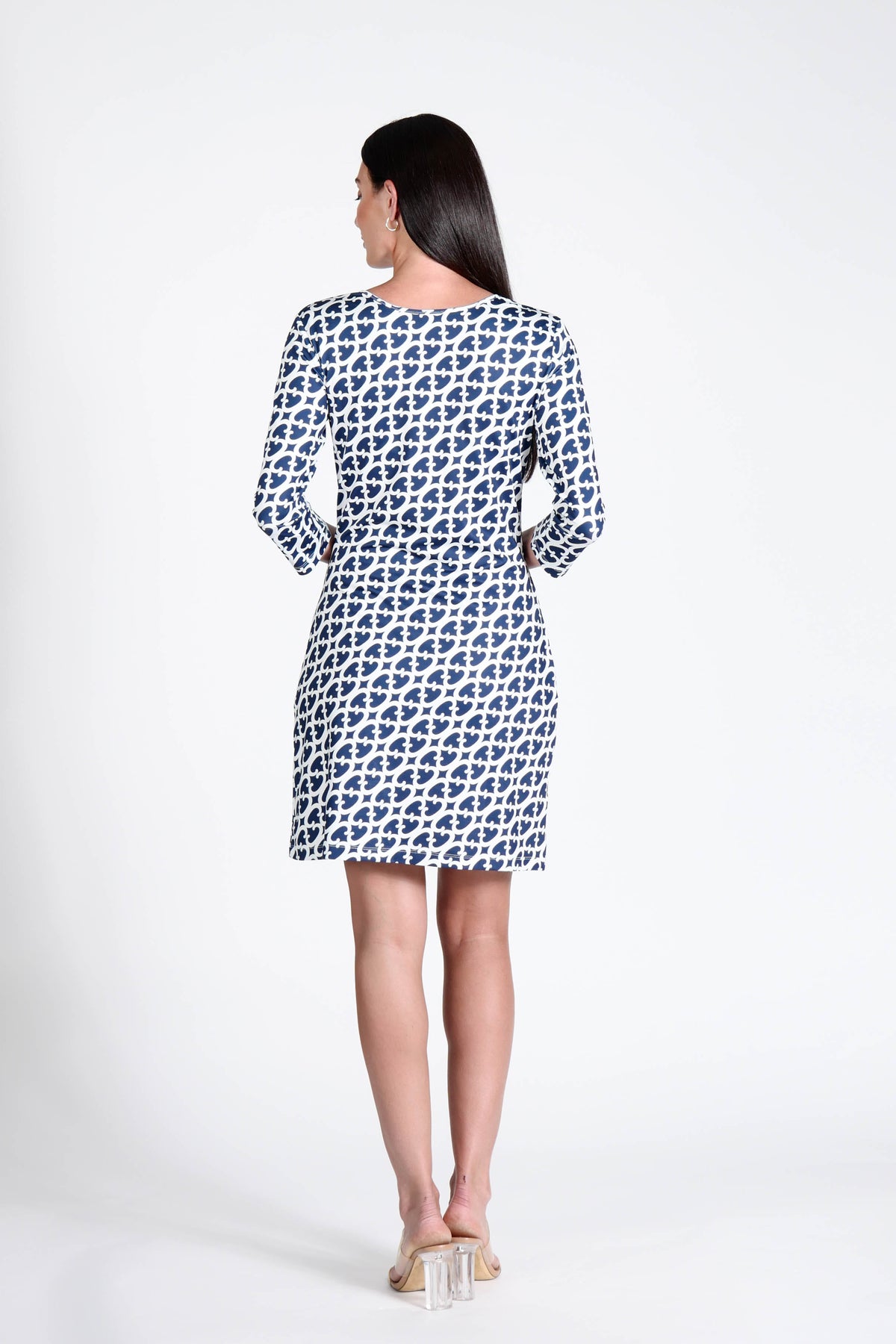 The feminine silhouette skims the body in a shift, classic fit and falls to a knee-length hem. The U-Neckline and 3/4 sleeves create a chic, comfortable look that pairs perfectly with heels or flats. The multicolor fabric adds a sophisticated touch while staying versatile for Go Anywhere or Cocktail occasions.
