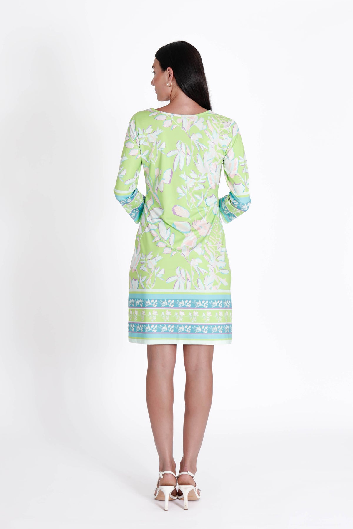 Designed in shades of green and blues with the Tokyo Garden pattern, it features a U-neckline, 3/4 loose sleeves, and a straight hem for a look that is both comfortable and trendy.
