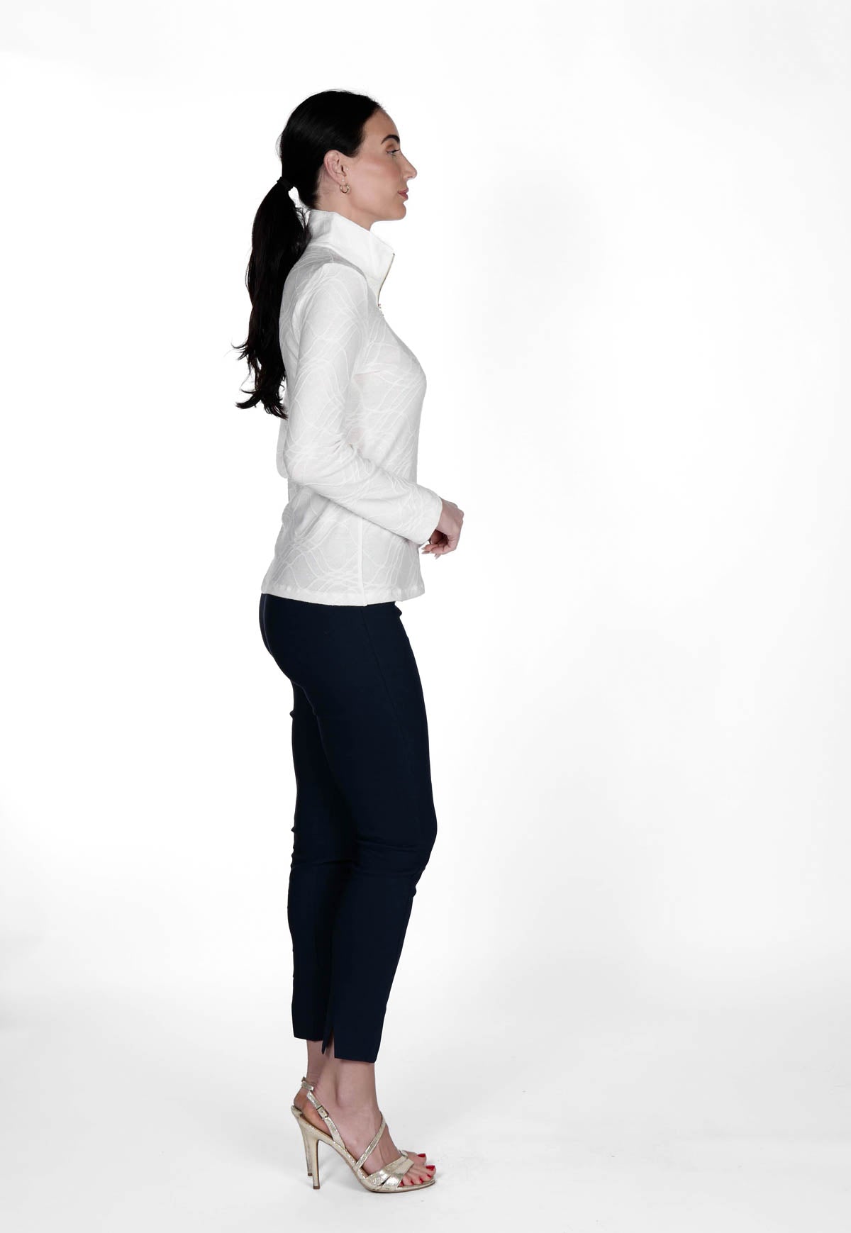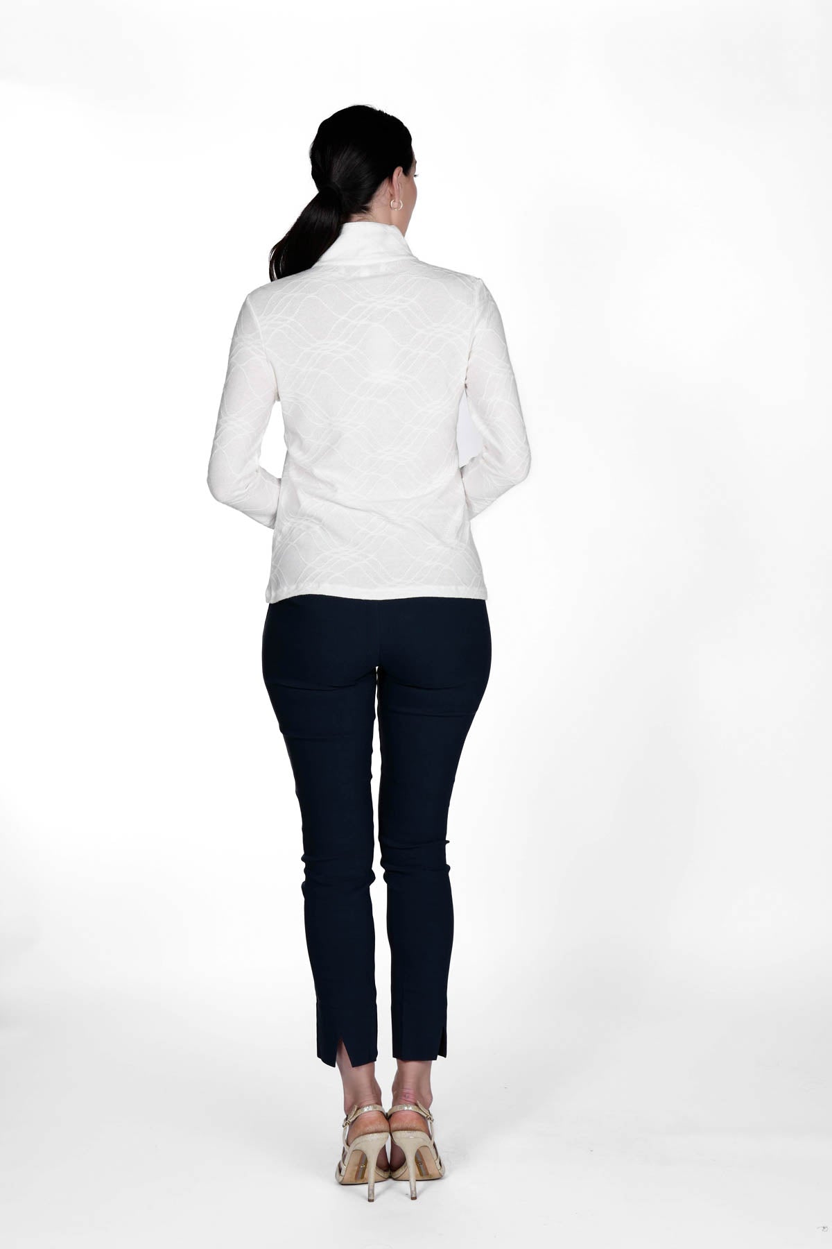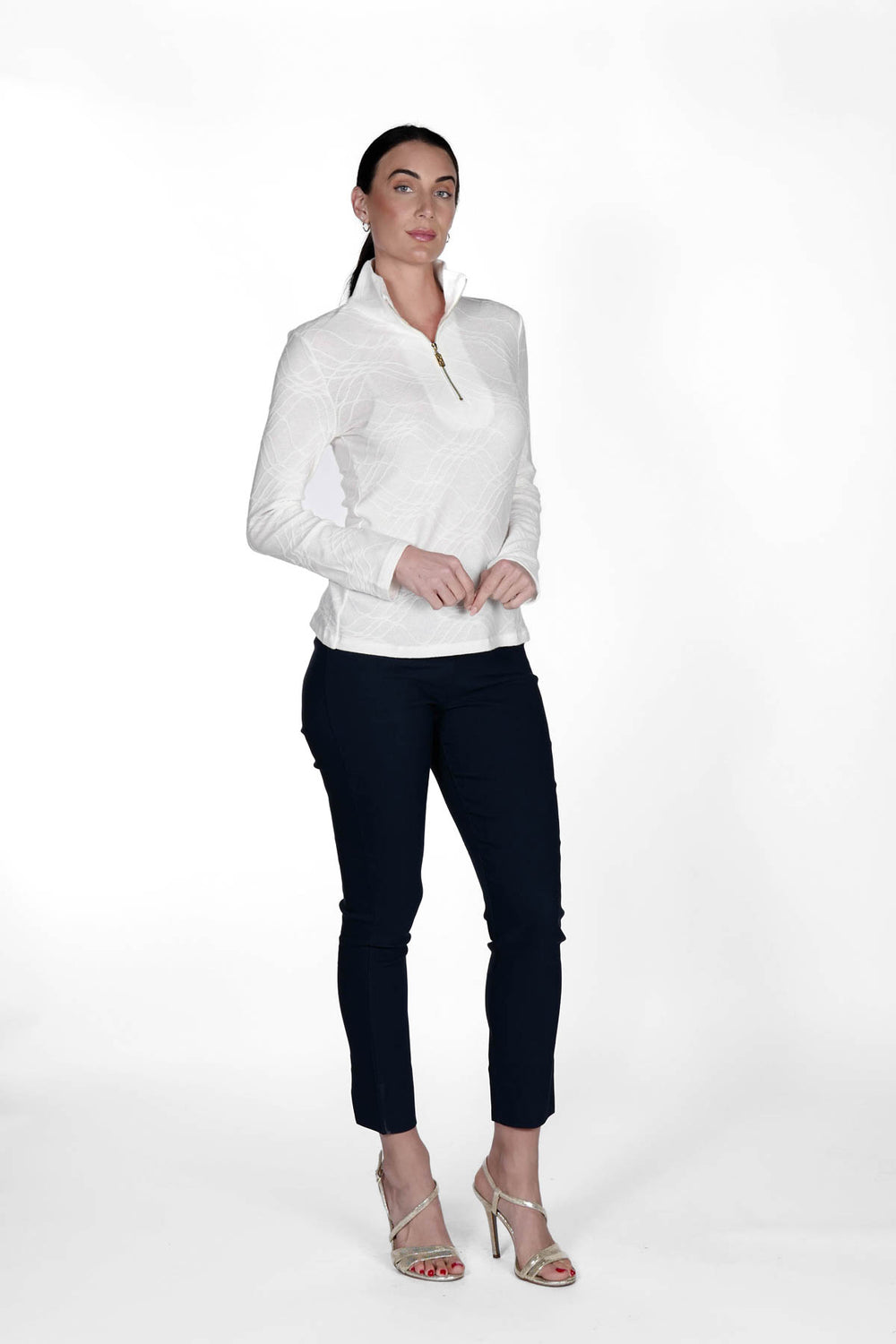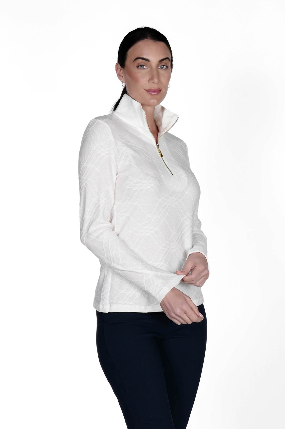 Classy meets feminine prep in our iconic golf top. The high collar is offset with a stylish quarter zip for a fun, sporty look. The Jacquard style features a soft material, perfect for layering or pairing with a nice coat.This top is slim-fitting, flattering and has the cutest sporty look! Shop our new colors to be on trend this season...