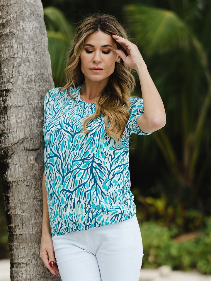 Introducing the All Season Top Coral Dance from Jean Pierre Klifa. This stylish top is perfect for any season, with a casual short sleeve, boat neck, and coral dance pattern. Crafted from a blend of light and soft fabrics, this top is sure to keep you comfortable and looking great. Available in multi-color, this top comes in sizes S, M, and L.