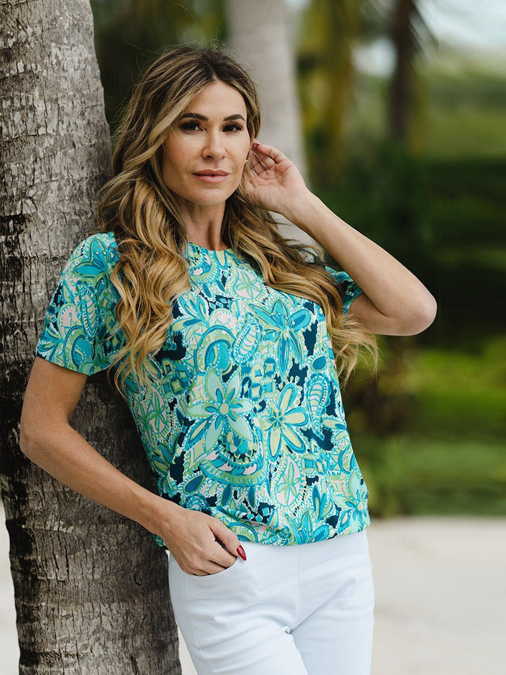 This All Season Top Bohemia is perfect for any season. With a casual style, short sleeve, boat neck, and bohemian pattern, this top is sure to make a statement. The fabric is a blend of light and soft fabrics, making it comfortable and breathable. The regular fit is flattering and easy to wear. Available in sizes S, M, and L, this top is perfect for spring, summer, and fall.